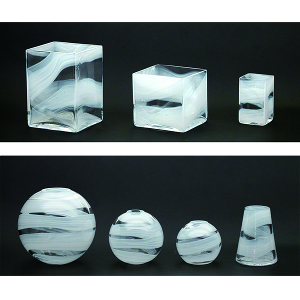 白のシルキーなラインをランダムにデザインした花器です。花や緑の色を際立たせるうように、形もシンプルな球体や立法体でまとめています。